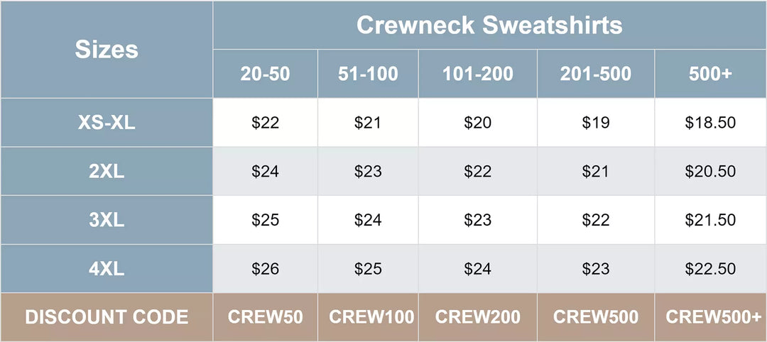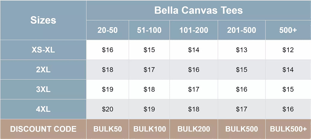 To place a bulk order through our store, please fill out your cart with all the shirts you would like. Then at checkout, use the appropriate discount code listed below.
